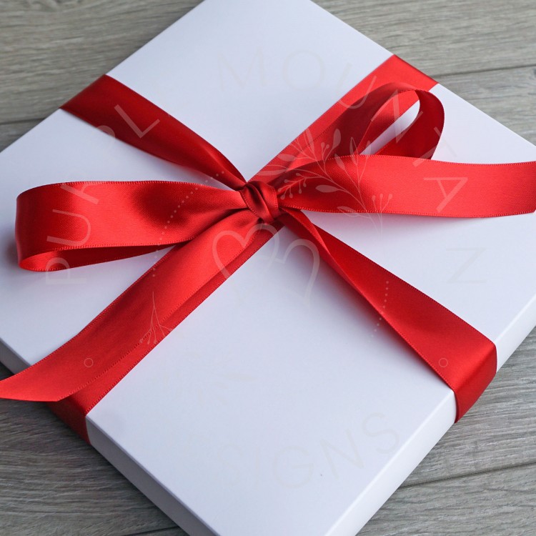 The design is created on a heavy white pearlescent card and comes with a lovely matching pearlescent white insert. The card is presented in a tissue lined box, tied with a satin ribbon.